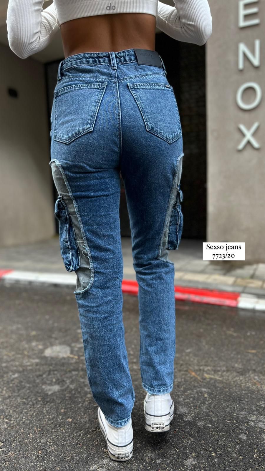 ג'ינס שילוב כיסים וטלאים , טרנדי ואופנתי , מחטב את הגוף . הדוגמנית לובשת מידה 0