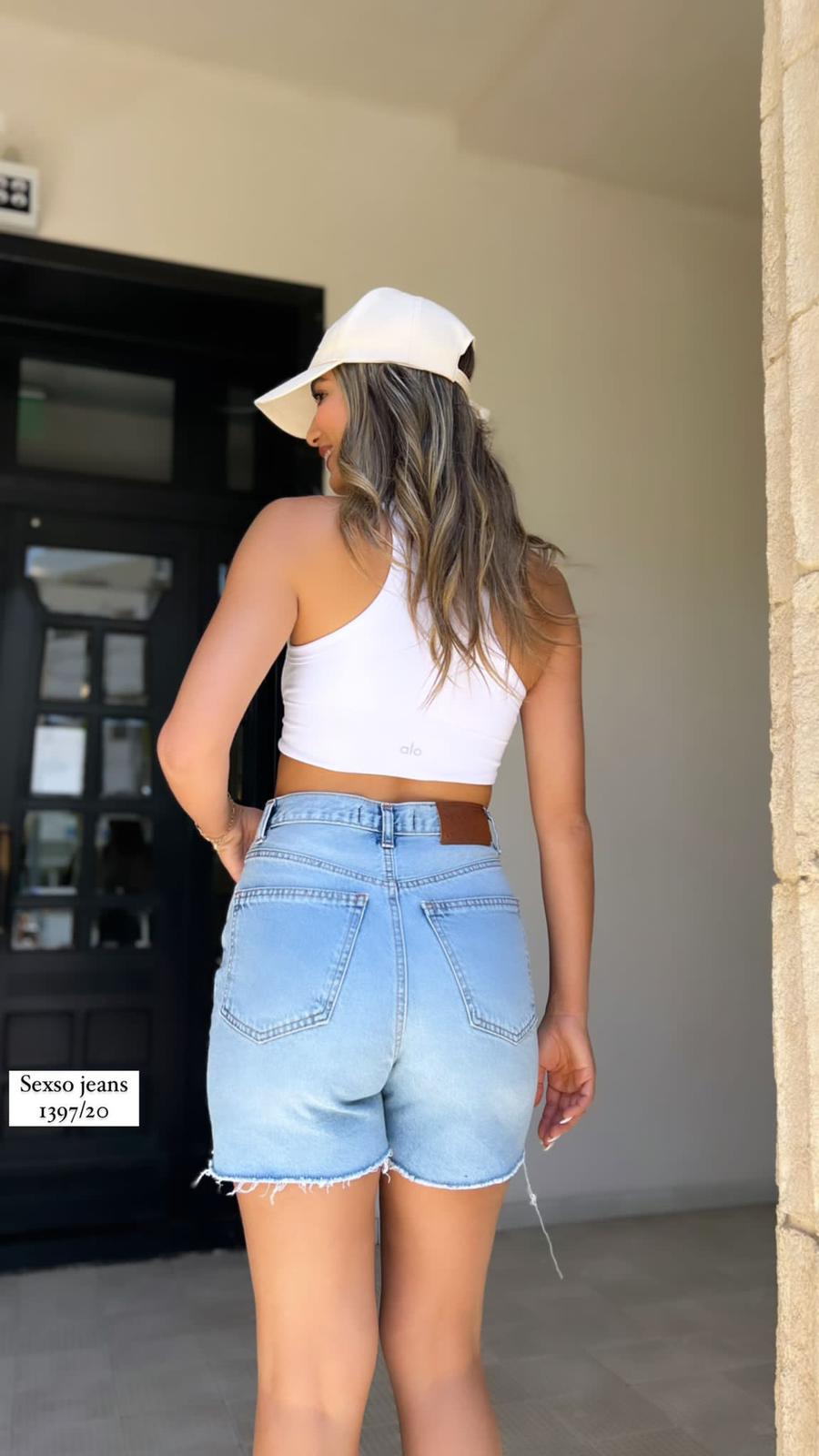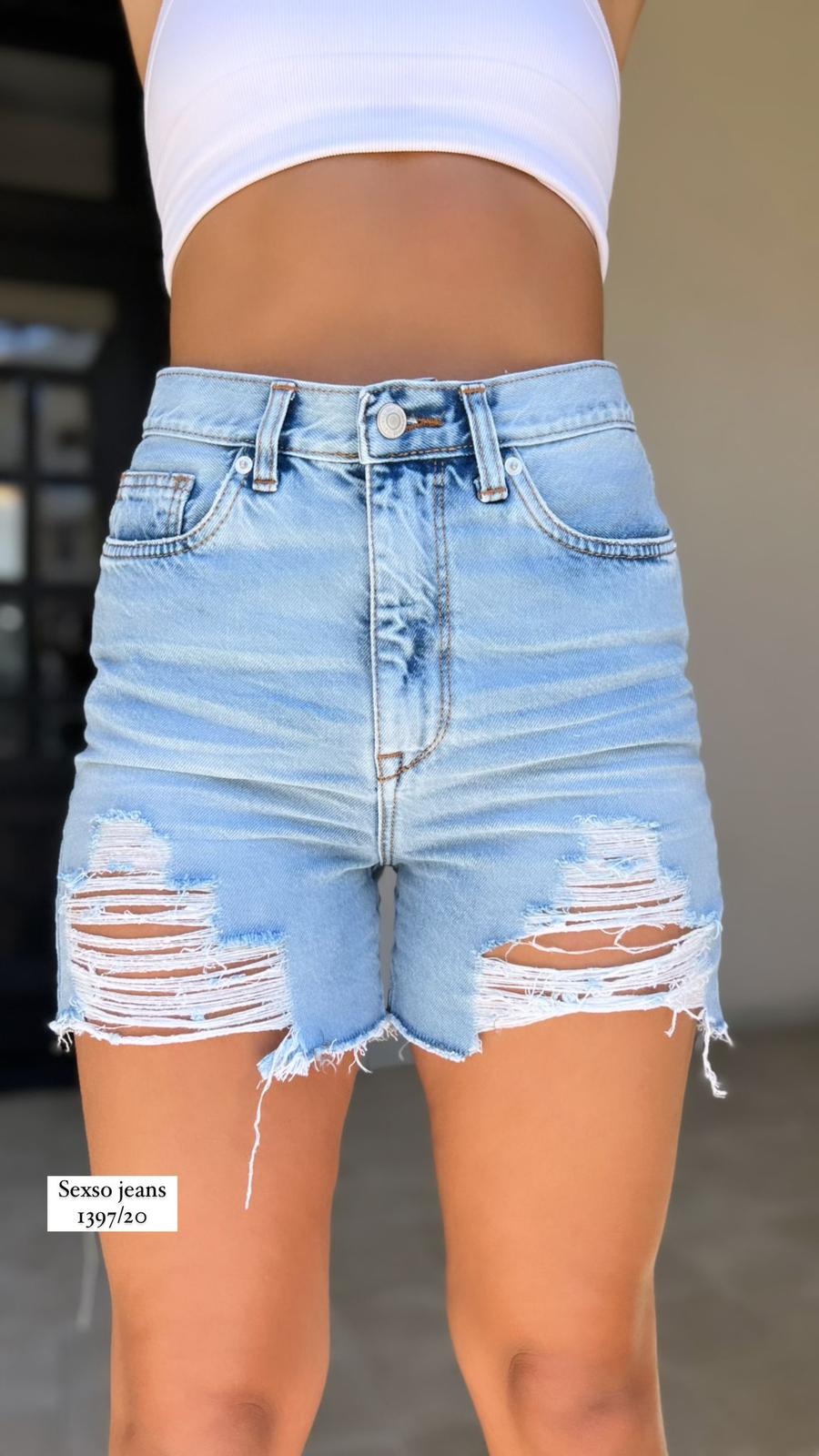 שורט ג'ינס בר בגזרה אמצע קלאסית ובשילוב קרעים, בד נעים ללבוש על הגוף, הדוגמנית לובשת מידה 24
