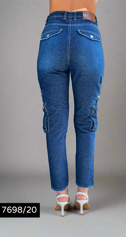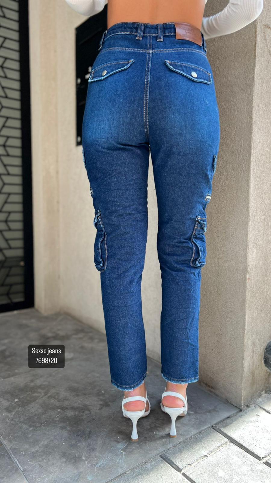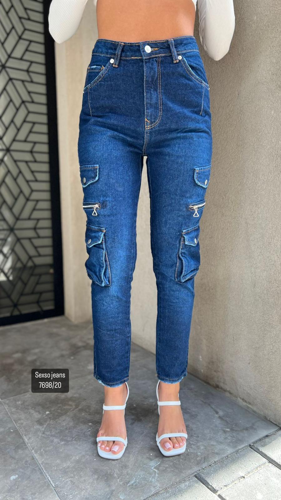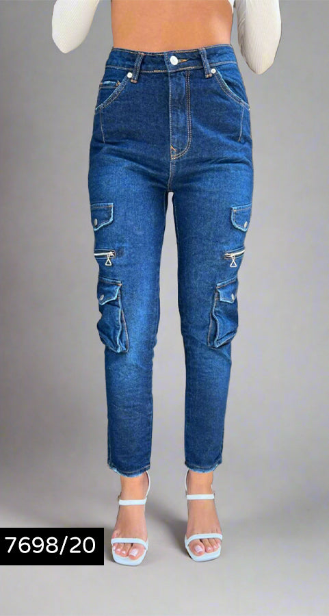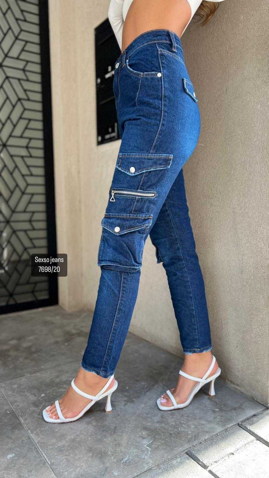 סקיני ג'ינס שייקו שילוב כיסים ורוכסנים בצבע כחול , גזרה אמצע מחמיאה ומחטבת , הדוגמנית לובשת מידה 0